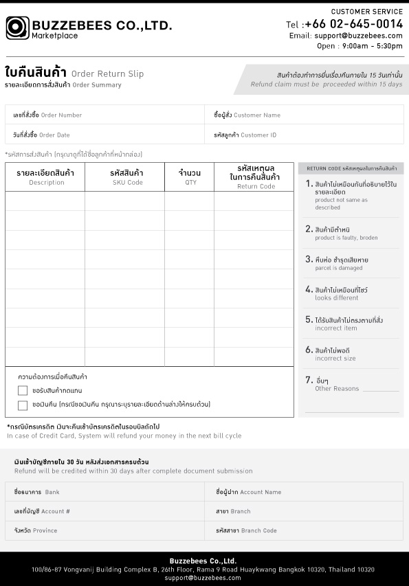 หากต้องการคืนสินค้ากรุณาติดต่อลูกค้าสัมพันธ์ที่เบอร์ 026450014